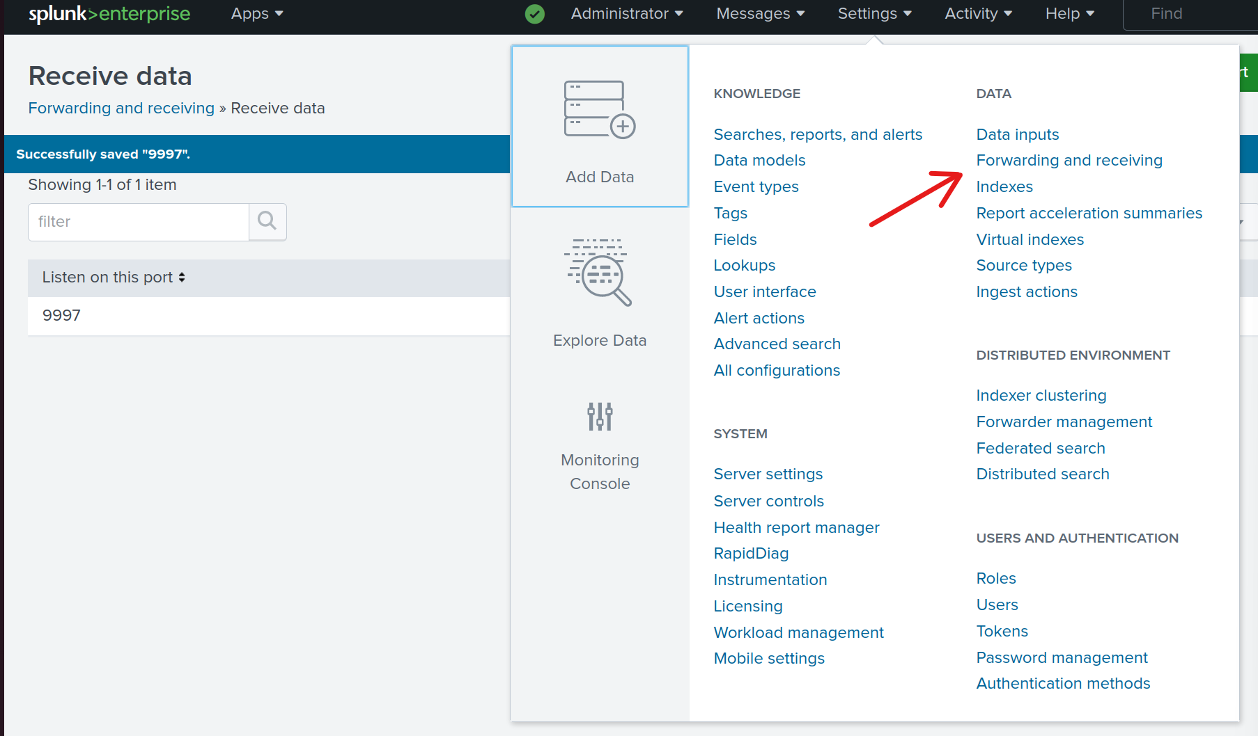 - Configure Splunk Enterprise to receive Data from Forwarders by going into Settings>Forwarding and receiving: