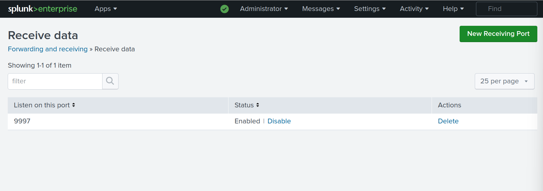 - Click on Configure receiving > New Receiving Port. Enter the port you wish to use to receive Data from Forwarders. I chose the default Port 9997. Click on Save, then you should see the following configuration on your page: