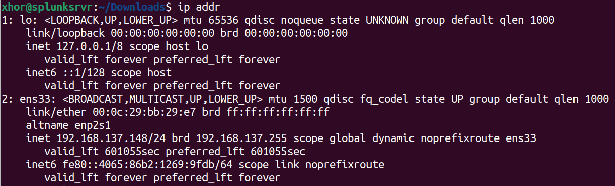 - Verify that your Listening Port is enabled, then check the IP-Address of your Splunk Server using the following command: