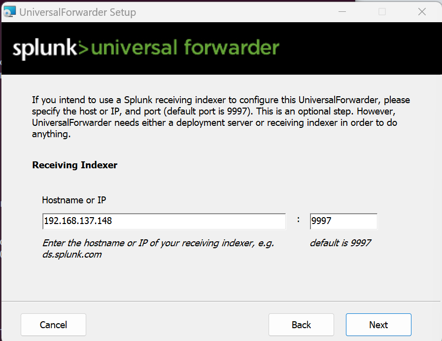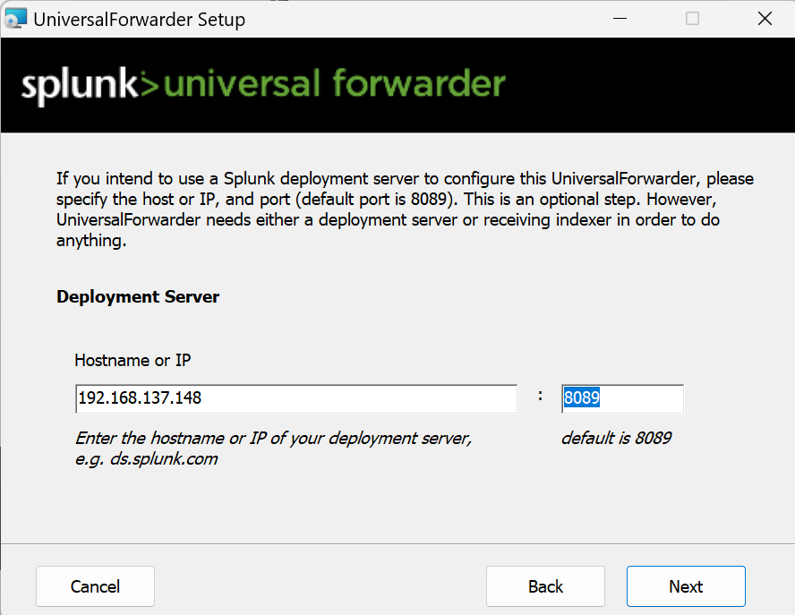 - In this step, we can configure a deployment server, which is useful when you have multiple hosts to manage. Enter the hostname/IP of your Splunk Enterprise Server and the Port (default if you haven't configured anything else). Then proceed by clicking Next.