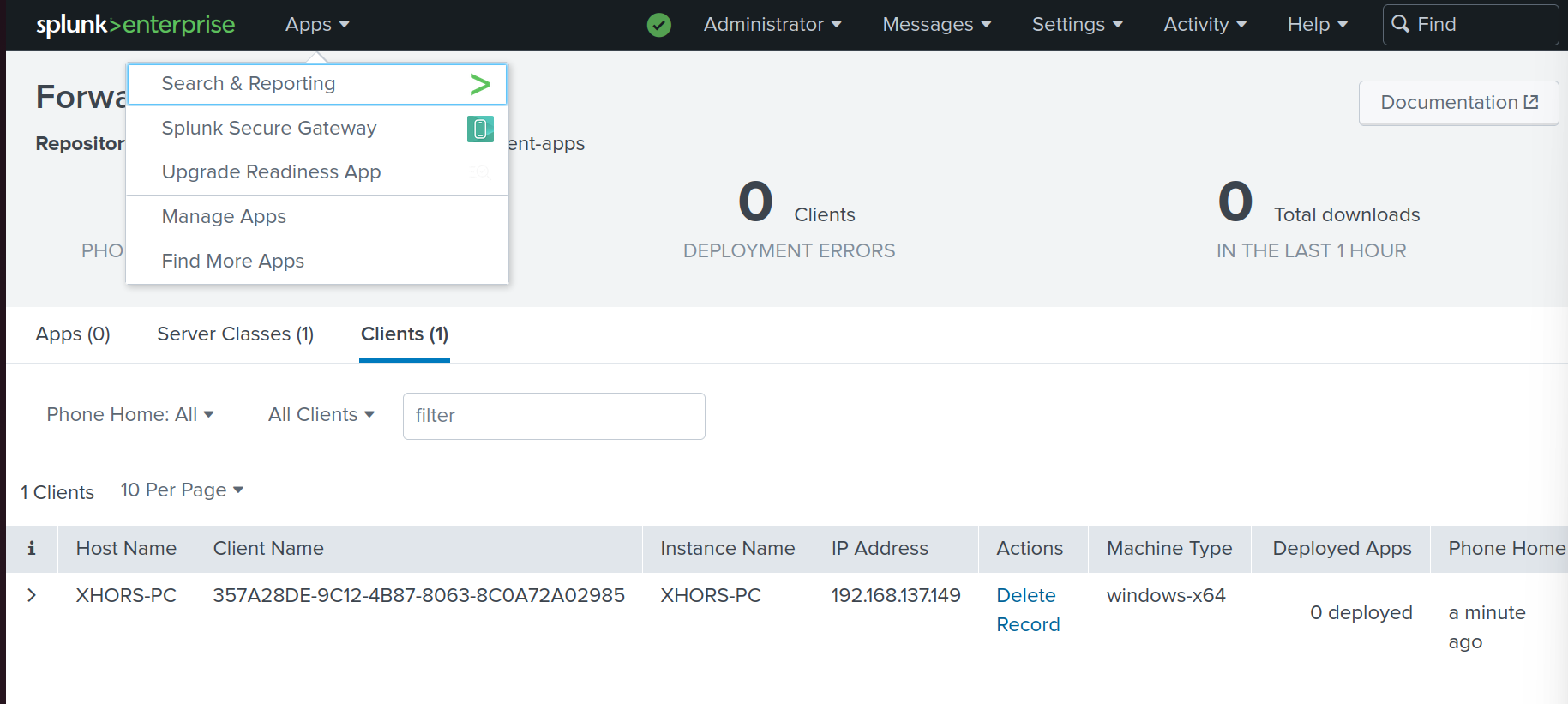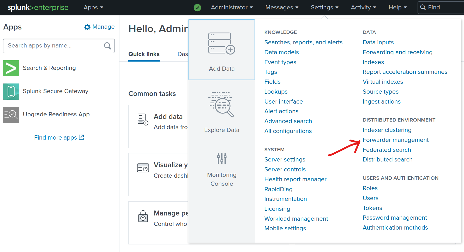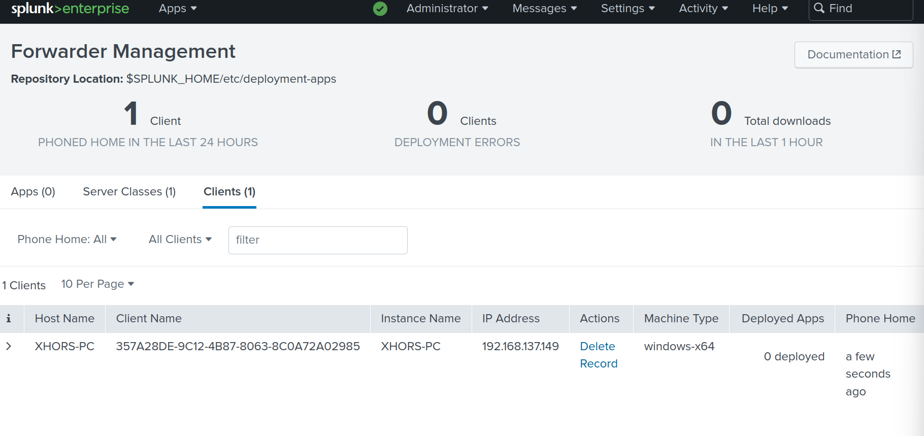 Now you have successfully configured the client to forward Data to our Splunk Enterprise Server running on Ubuntu Linux. If you configured the Deployment Server, you can verify that the Forwarder has connected to the Server by opening Settings > Forwarder Management: