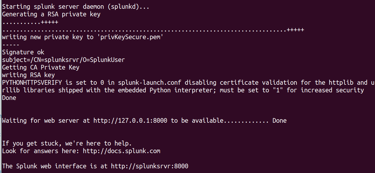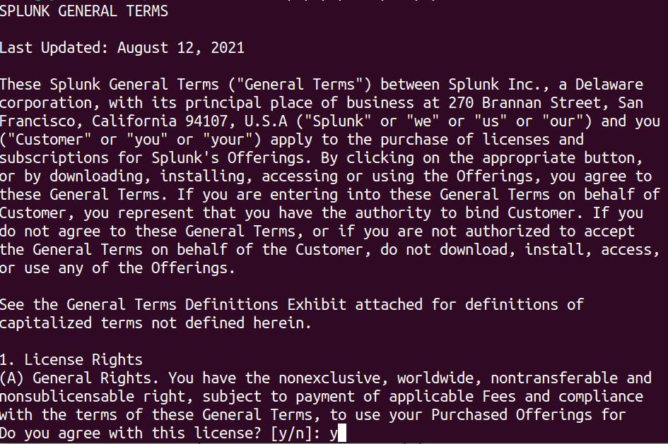 sudo /opt/splunk/bin/splunk start- You will be prompted to accept the general terms. Just press "q", then press "y" to accept the terms followed by pressing Enter: