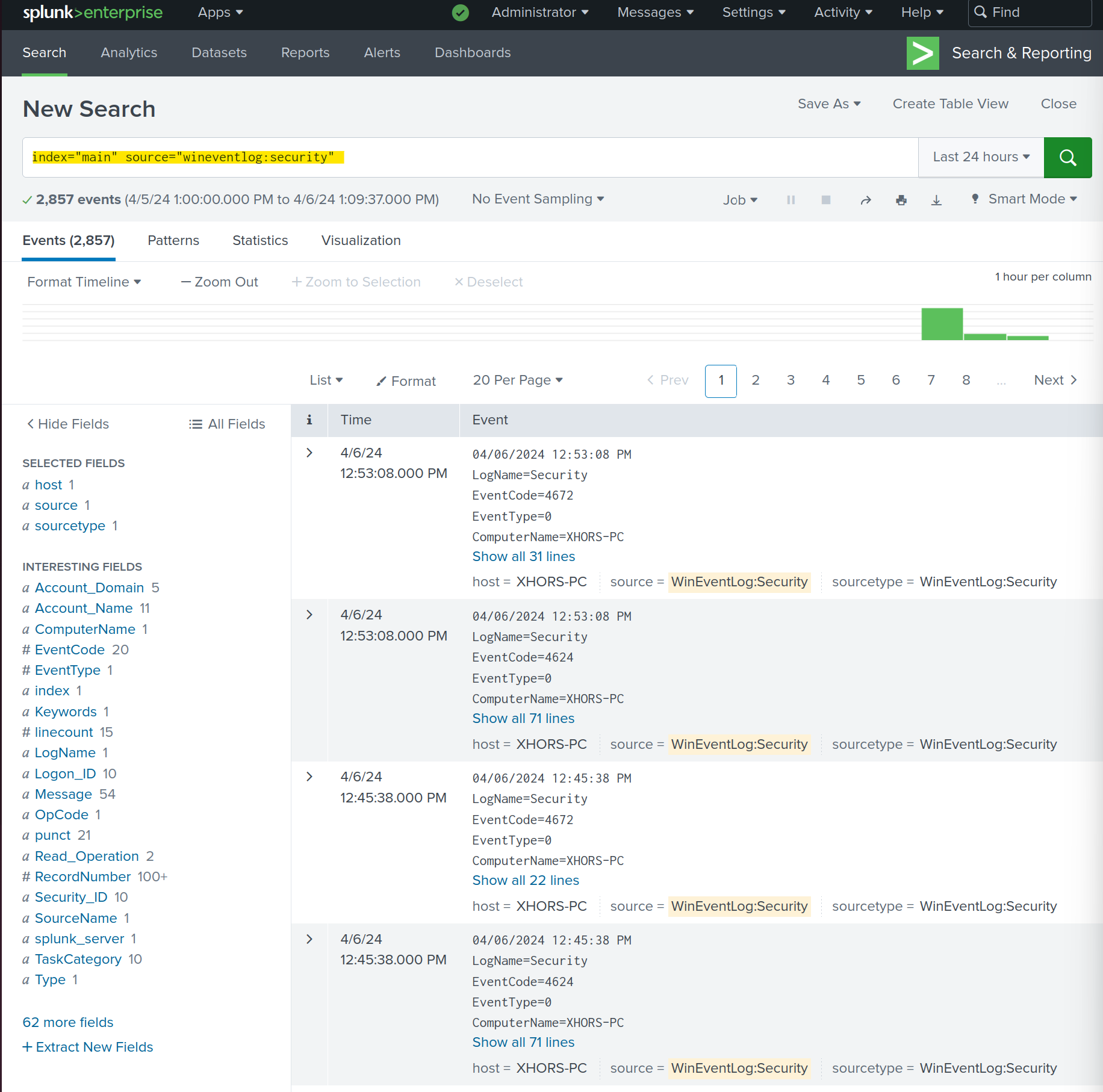 index="main" source="wineventlog:security"This line will return all logs collected from our Windows Security Event Logs. You can start to play around with the GUI and try out some SPL queries: