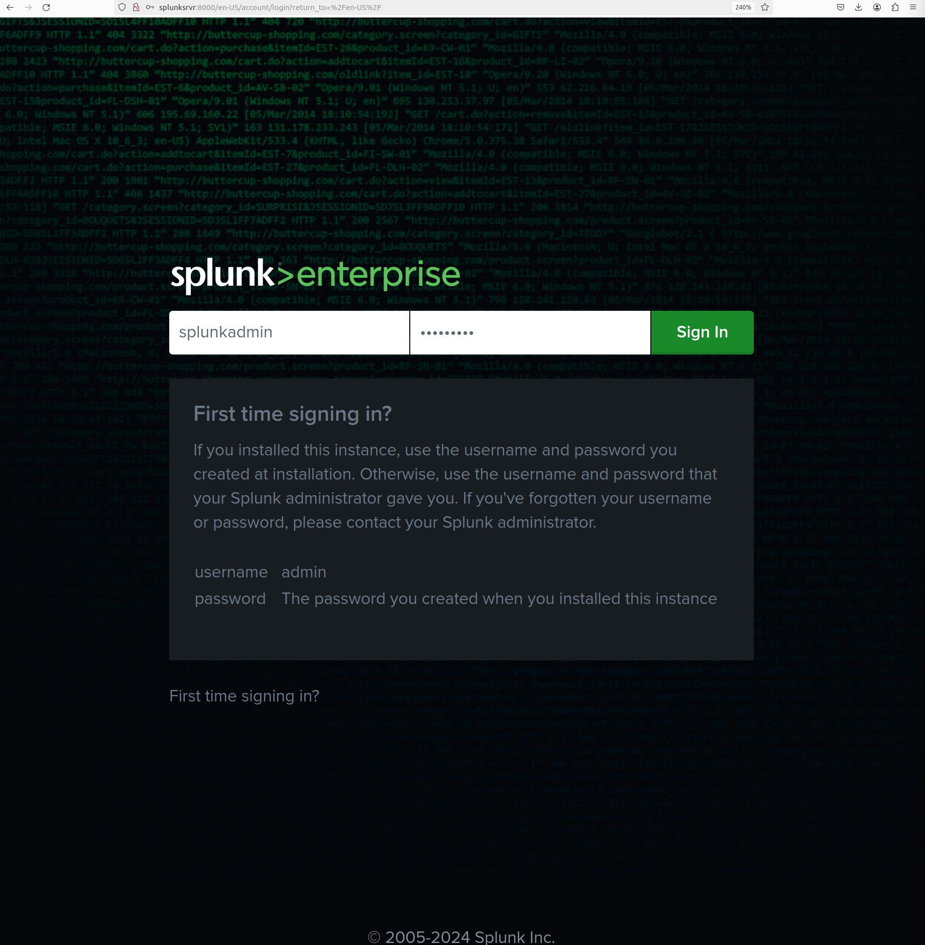 - Then setup the credentials you want to use for your Splunk Admin Account. After you entered your credentials, Splunk Enterprise will be installed and you will be given a Web-Interface URL: