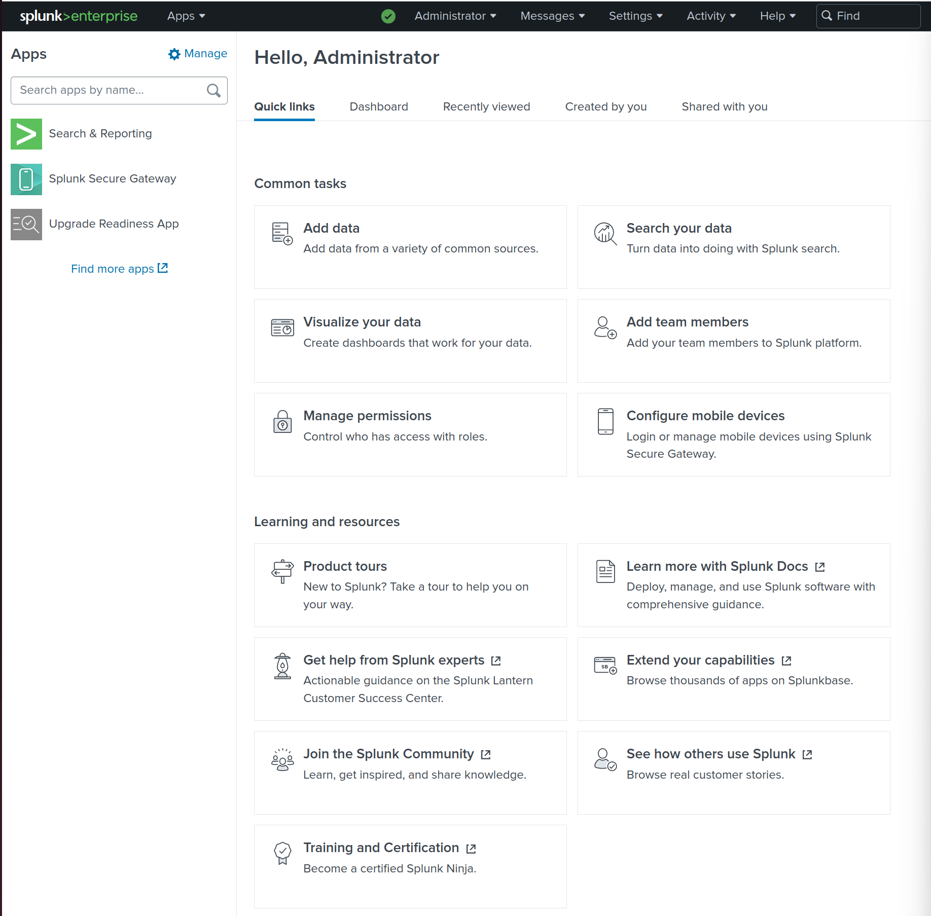 - After authenticating, you will be greeted by the Splunk Enterprise Homepage: