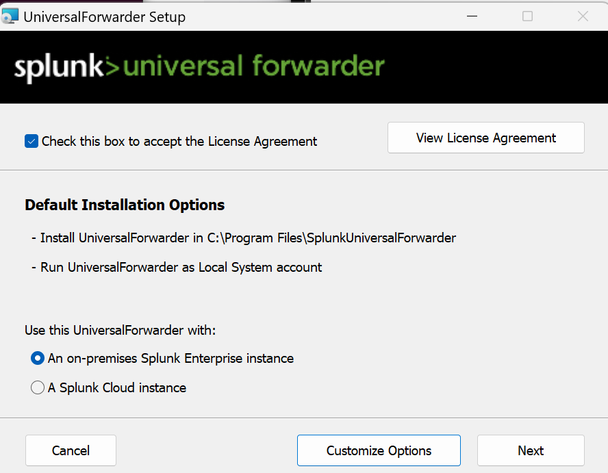 - Execute the downloaded .msi File on your Windows host. Check the License Agreement Box. Then click Customize Options: