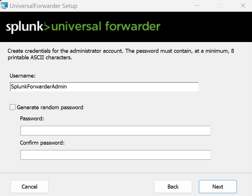 - Create an administrator account for the forwarder. Click Next after you're done: