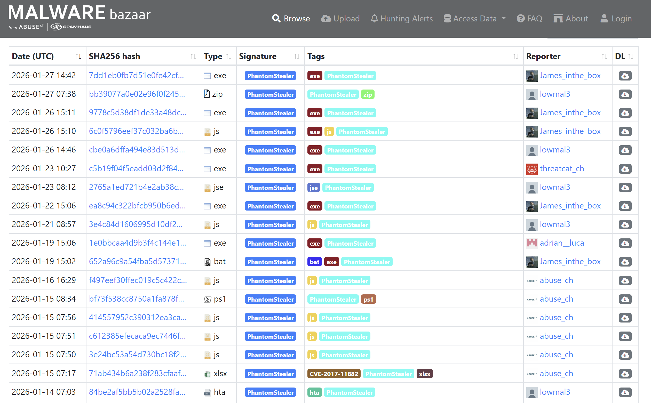 One calm evening, I was browsing MalwareBazaar and saw a bunch of submissions belonging to the malware family "PhantomStealer":