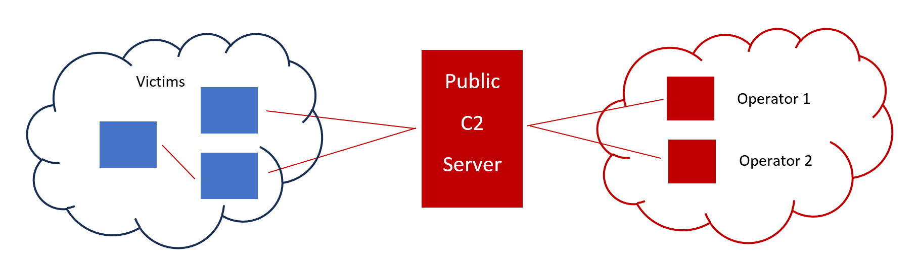A Command and Control (C2) Framework provides these features to the operators. The most common architecture consists of the C2 Server, which is usually publicly available and has multiple compromised hosts connecting to it, and the C2 Client, which operators use to connect to the C2 Server and control/perform actions on the onboarded devices.