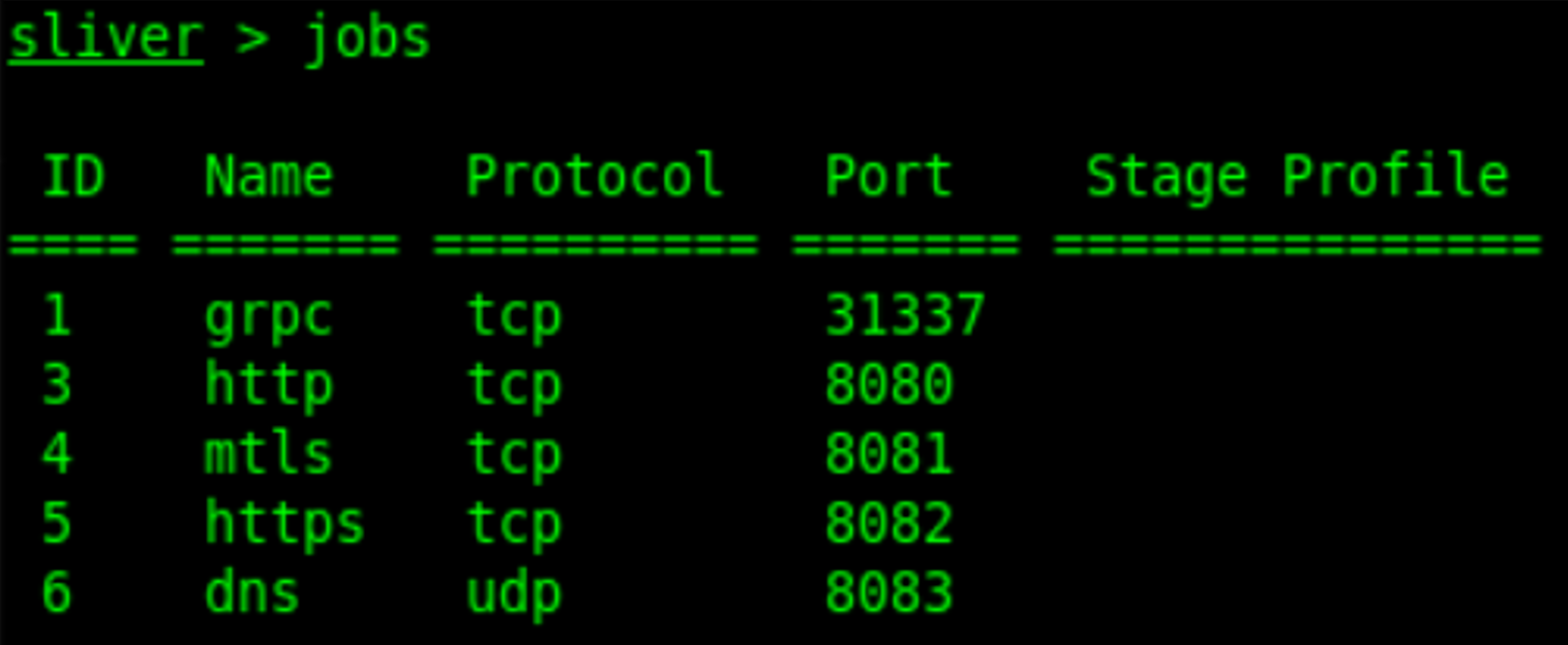 dns -l 8083 -p You can verify the setup using the jobs command. There will always be a GRPC job on port 31337, which is the listener for the Multiplayer-Feature of the C2 Server allowing multiple operators to connect using the Sliver client. If you configured the listeners listed above, you should see the following output: